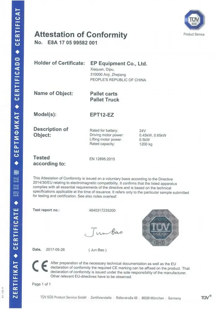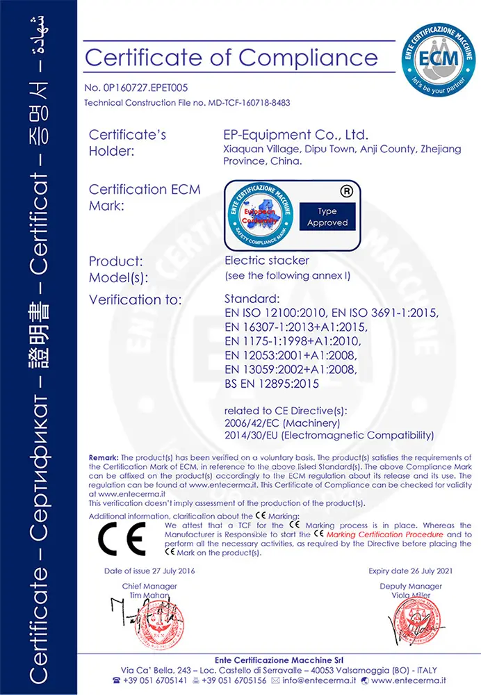 Сертификат EP-Equipment электрического паллетоукладчика