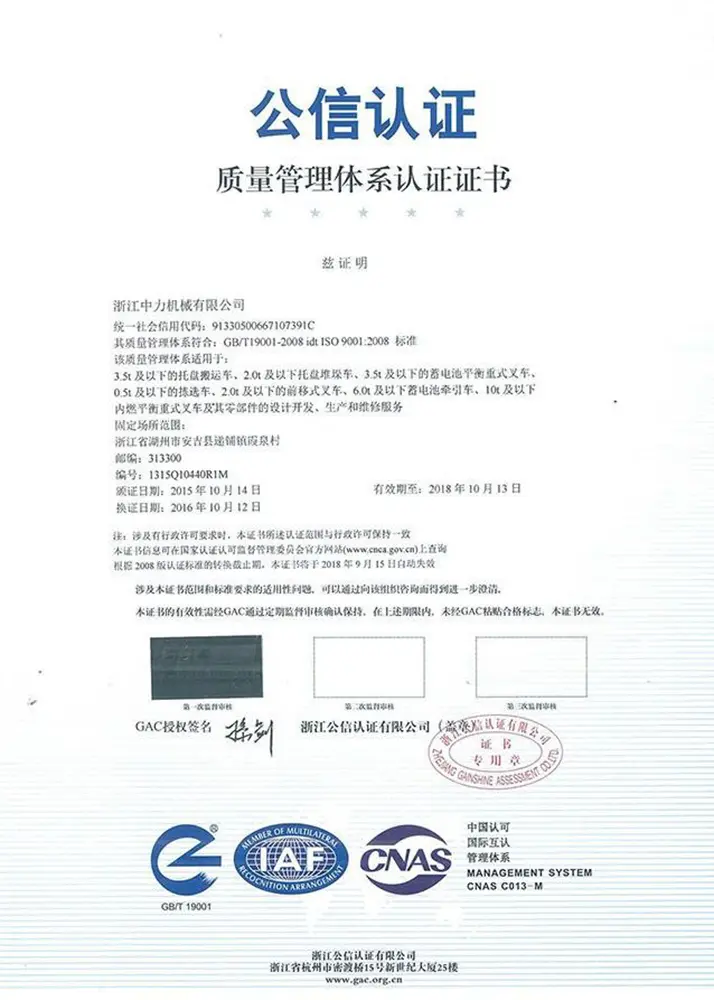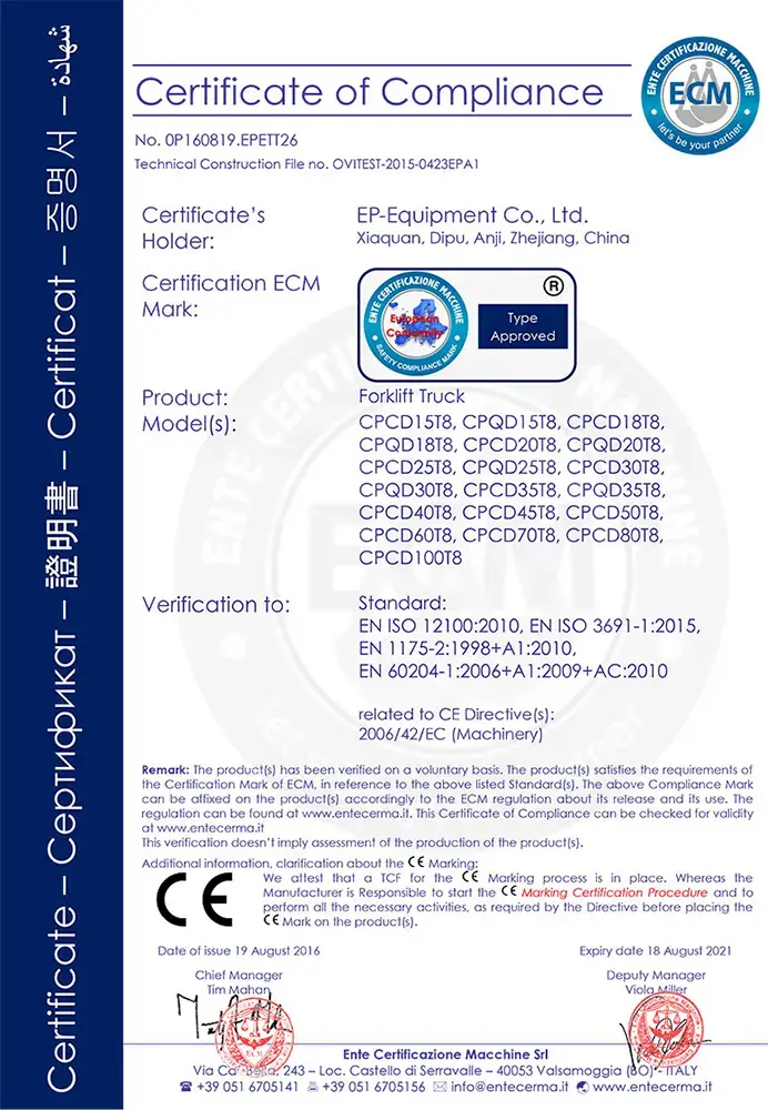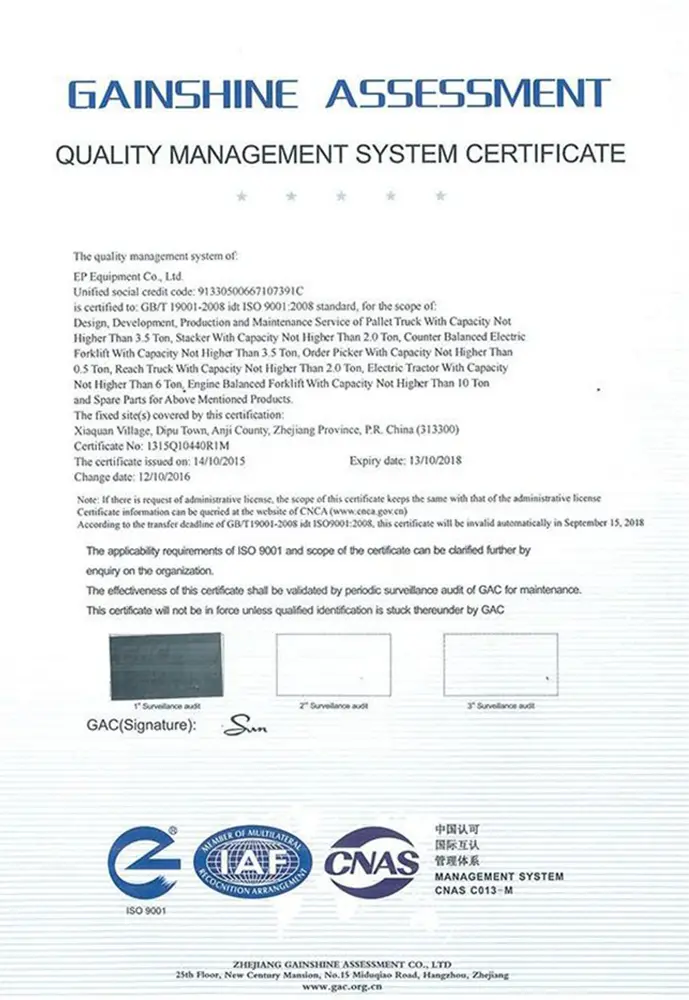 Сертификат EP-Equipment качество вилочных погрузчиков